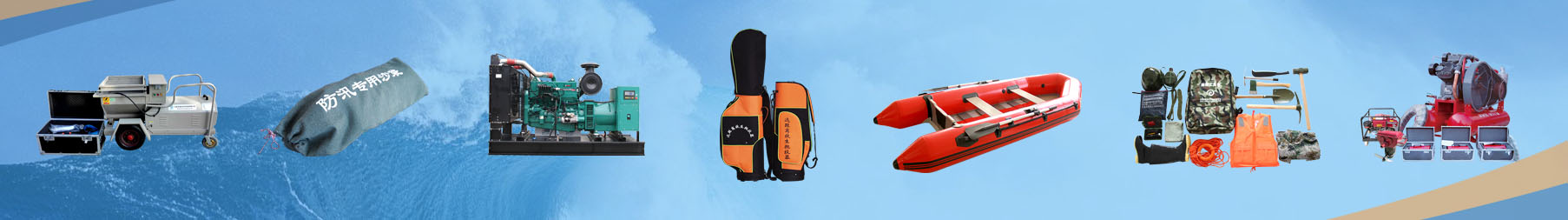 堵水类: 拆卸堵水墙、铝碳素钢堵水墙、防汛沙袋、吸潮增加袋、组装等式堤、组装式围井。 抛射类:法式抛投器、韩式抛投器、远范围抛投器、全自动抛投器、船用全自动抛绳器、75式抛投器。  基础桥桩施工施工类:ZL-020型基础桥桩施工施工机、ZL-120型基础桥桩施工施工机、ZL-200型基础桥桩施工施工机、气油基础桥桩施工施工机。 照航灯具设计系统设计产品/设配:防暴照航灯具设计系统设计灯、手提箱照航灯具设计系统设计灯、出台照航灯具设计系统设计灯、手机移动照航灯具设计系统设计灯、举升照航灯具设计系统设计车、头戴照航灯具设计系统设计灯、强光照电筒。 搜救车辆运输:水路两栖车、玻璃窗钢冲锋陷阵舟、充汽橡胶艇、救生浮船、气垫霜船。 抢修工具软件:铁锹、洋镐、工兵铲、鈀、锄头、十磅锤、菜刀、方铲、电锯、锯开机、扩张期器、救生绳、千斤顶、金属袋。 着装武器装备:防汛对战服、防寒防冻塑料雨衣、双背带、救生衣、水鞋、洗脸毛巾、水壶、自行车头盔、二氧化氮瓶、潜水服、二氧化氮罩。 海上自我保护裝备:救生圈、救生浮筒、手环式救生衣。 医疗仪器类:水氧化还原电位衡量仪、水的位置线衡量仪、饮用水质衡量仪、水的位置线监测站仪。